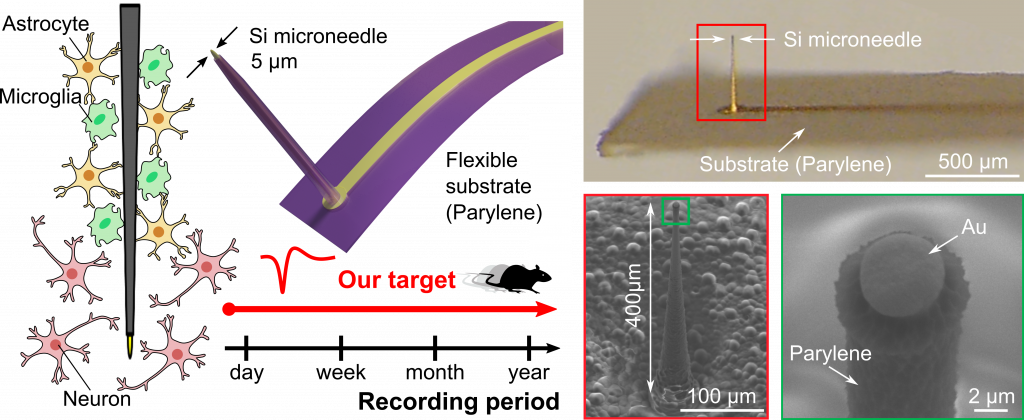 Fig. 1 A 5-µm-diameter silicon microneedle electrode device. The microneedle electrode integrated on a flexible substrate minimize damage to brain tissue and enable long-term neural recording exceeding one year.
